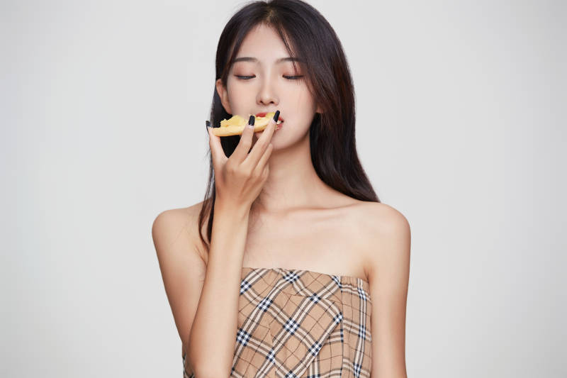 吃西梅的身穿白色長T血襯衫的長發(fā)少女人像