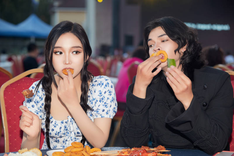 啃咬番茄身穿格子吊帶裙的亞洲可愛少女人像