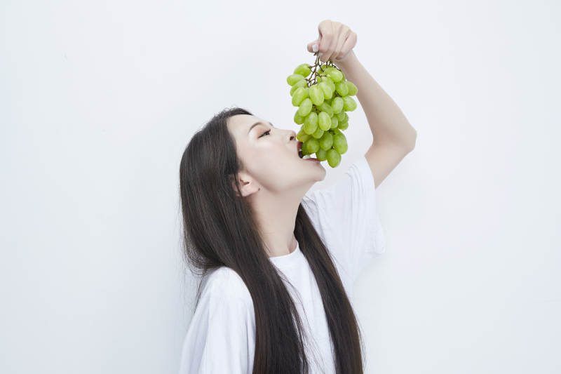 吃葡萄的穿白色長T血衫的長發(fā)可愛少女人像