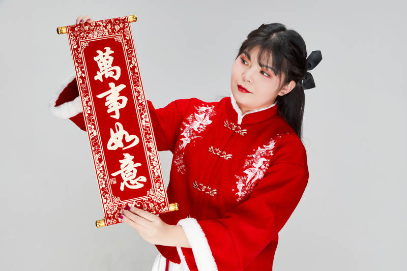 手持春聯(lián)身穿喜慶漢服的可愛(ài)少女