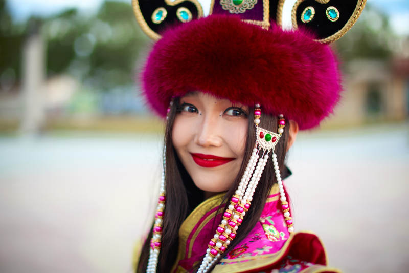 身穿蒙古族部落華麗傳統(tǒng)服飾的蒙族姑娘