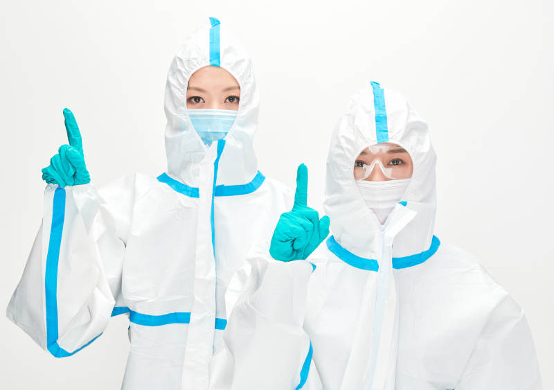 穿白色防護(hù)服佩戴護(hù)目鏡口罩的防疫人員