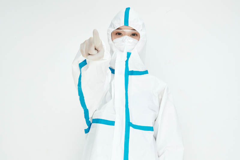 穿白色防護(hù)服佩戴護(hù)目鏡口罩的女性醫(yī)療人員