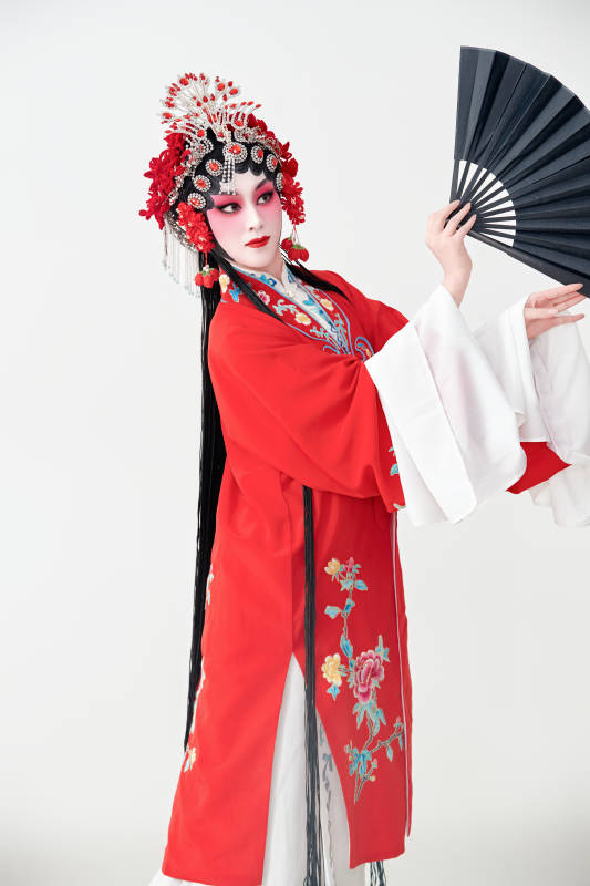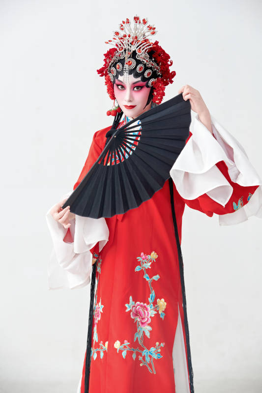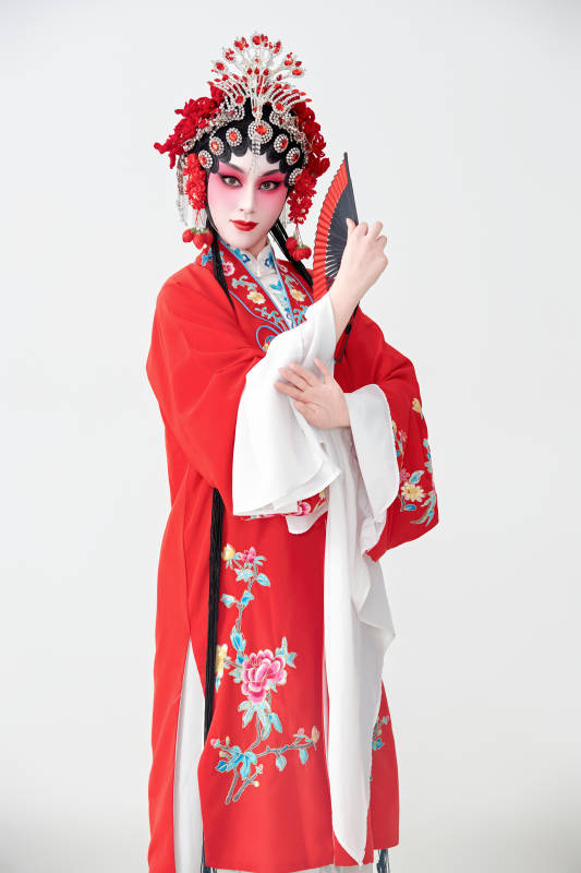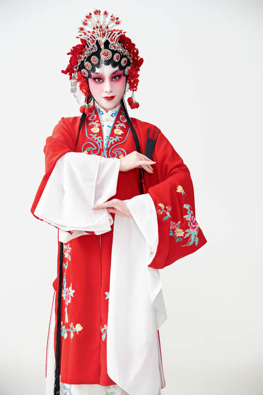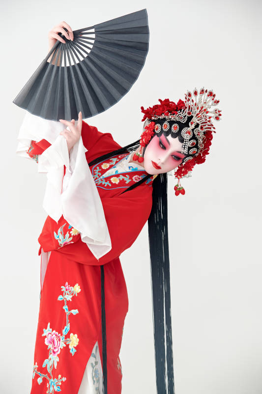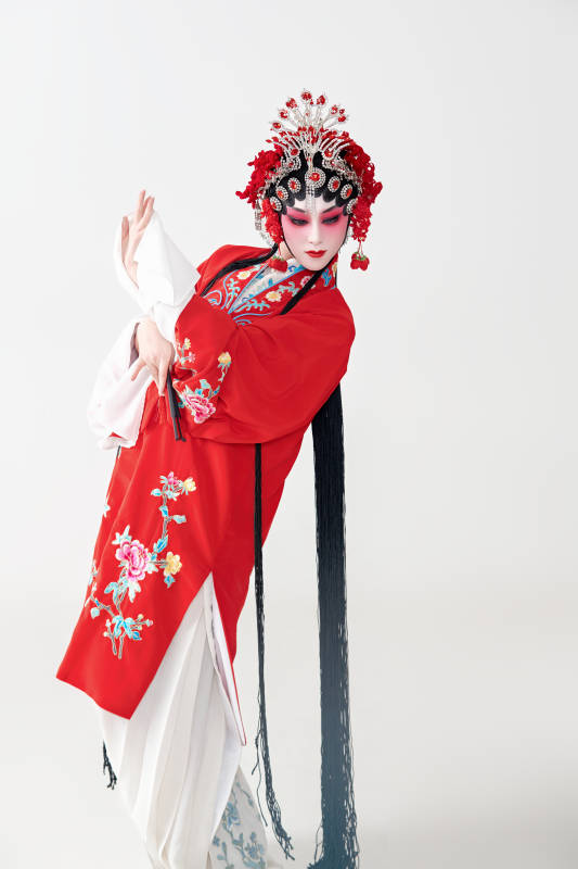 表演中國國粹京劇動作的紅衣花旦女性演員