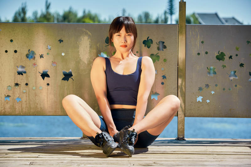 戶外河畔公園做拉伸有氧運(yùn)動(dòng)的亞洲女性