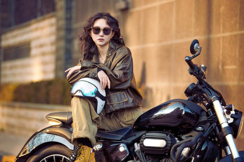 夕陽(yáng)午后騎復(fù)古摩托進(jìn)行拍照的東方美女