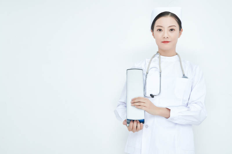 身穿護士服手抱化驗托盤的年輕女護士