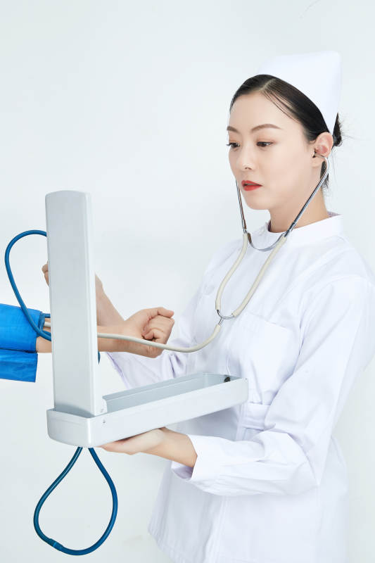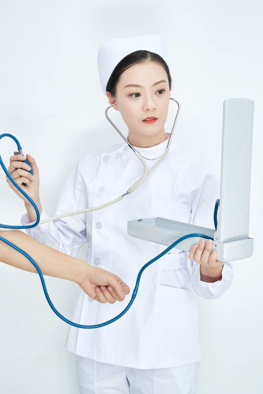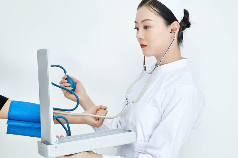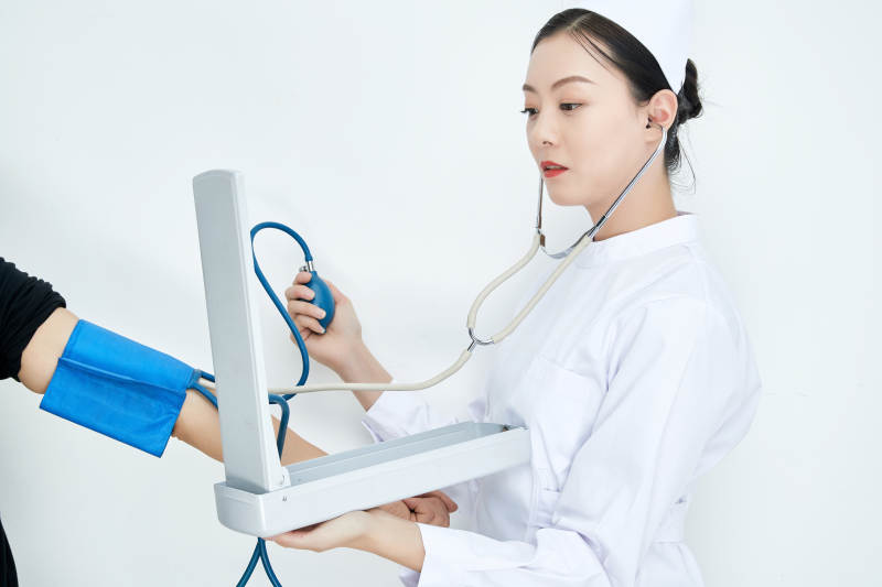 白色背景下手持血壓計測量血壓的醫(yī)生