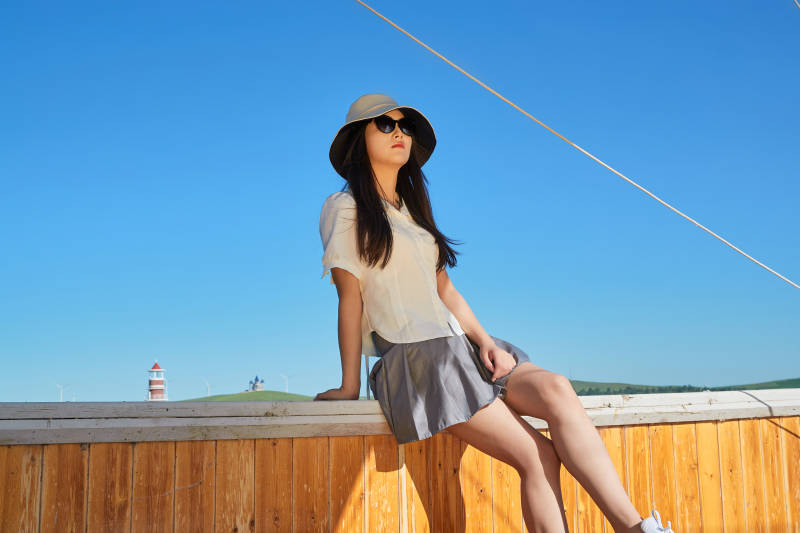 盛夏在景區(qū)湖邊燈塔上拍照游玩的美女