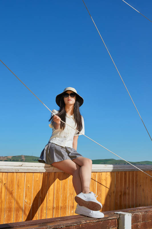 盛夏夕陽(yáng)晚霞湖邊碼頭看風(fēng)景的少女