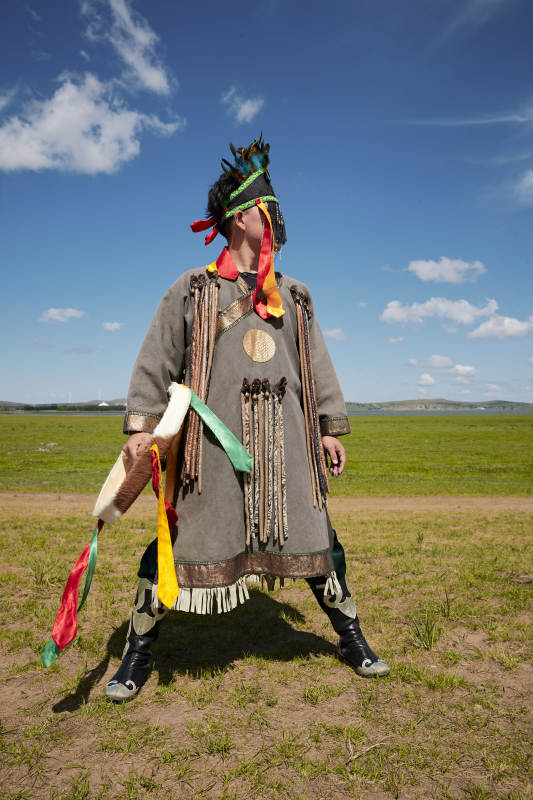 草原上的蒙古薩滿祭祀表演的舞蹈舞者