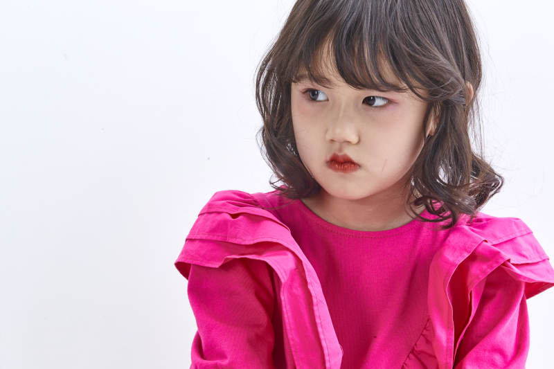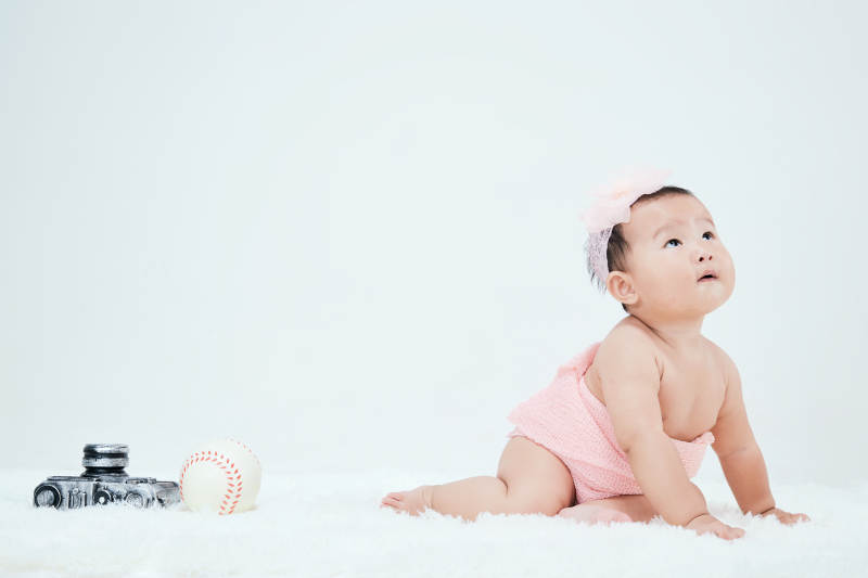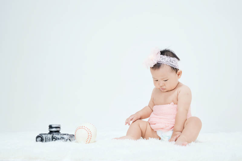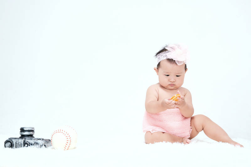 白色背景里坐在凳子上的可愛(ài)的亞洲小女孩兒童
