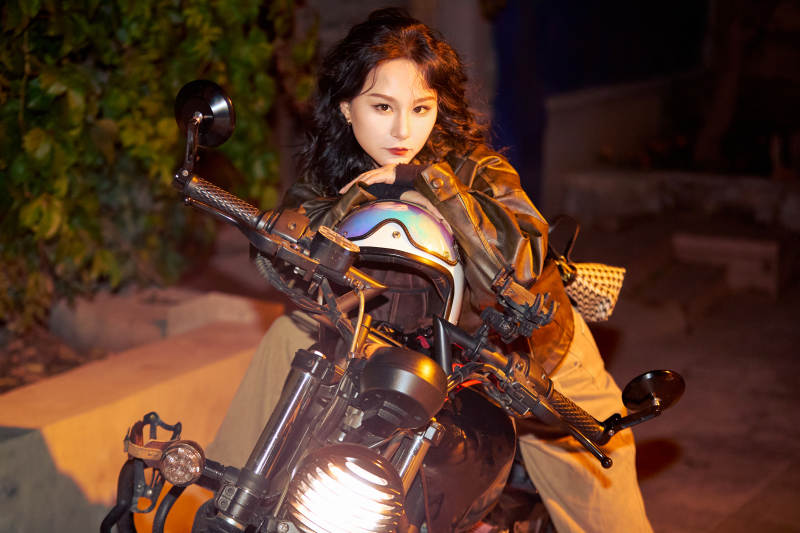 夕陽午后騎復(fù)古摩托進行拍照的東方美女