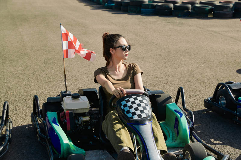 在游樂場卡丁賽道上駕駛卡丁車的美女