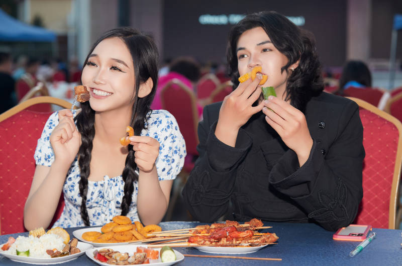 在戶外冷餐自助餐會(huì)大吃特吃的情侶