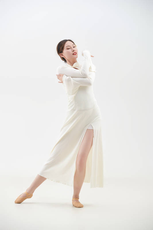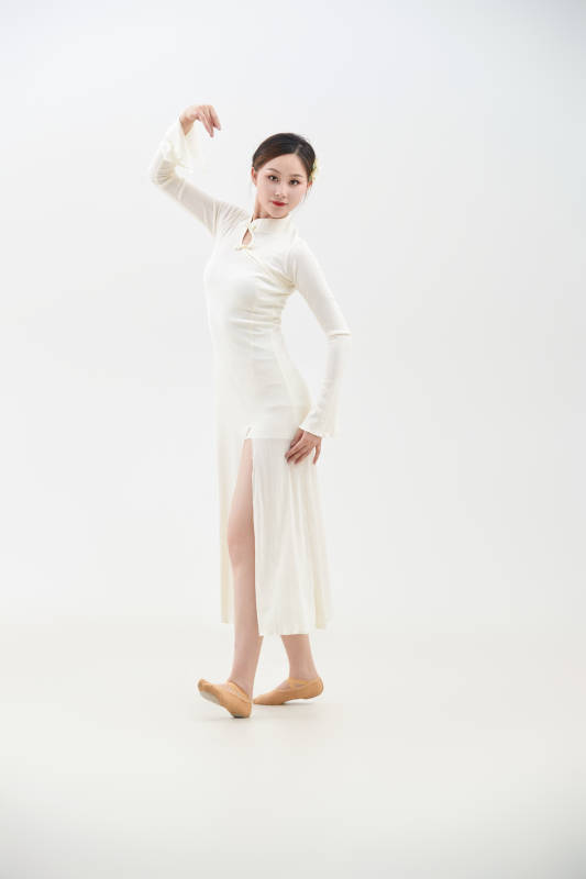 穿著白色旗袍頭戴絹花的跳古典舞的少女