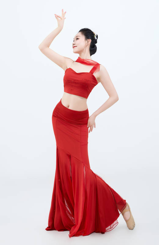 身穿紅黑相間的舞蹈長裙翩翩起舞的少女