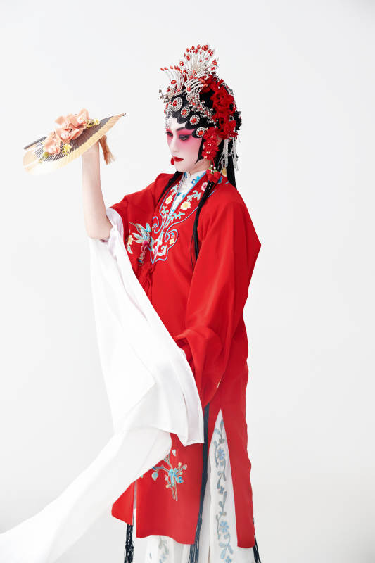 表演中國(guó)國(guó)粹京劇動(dòng)作的紅衣花旦女性演員