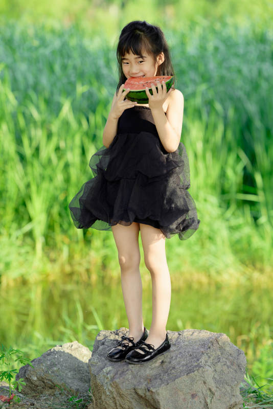 夏季在戶外游玩吃西瓜的可愛亞洲女童