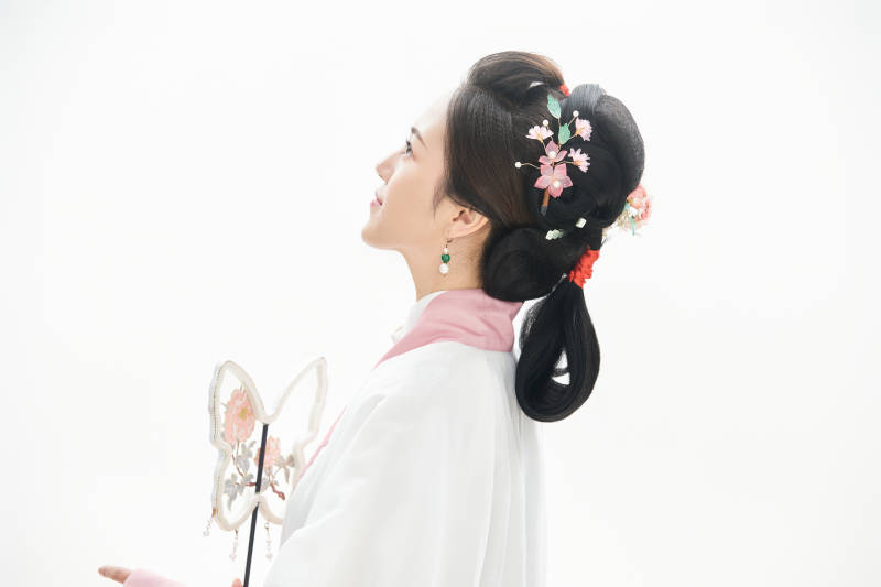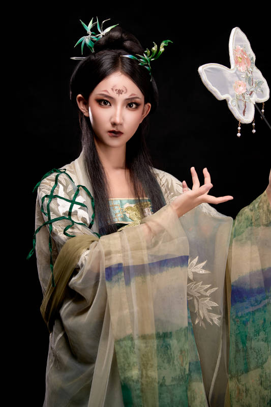 手持蝶扇展示唐代服飾妝容造型的東方女性