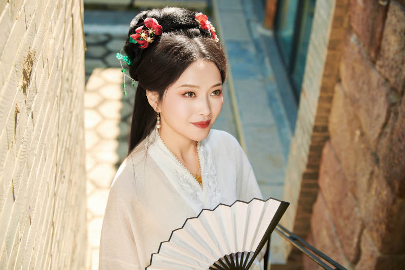 盛夏在別墅陽臺(tái)上拍照的亞洲美女