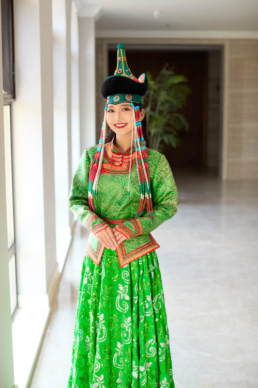 室內(nèi)穿著綠色蒙古袍的蒙古族年輕女性