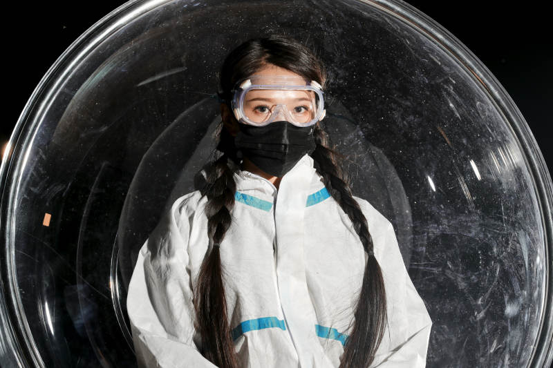 穿白色防護服佩戴護目鏡口罩的女性防護人員