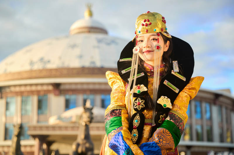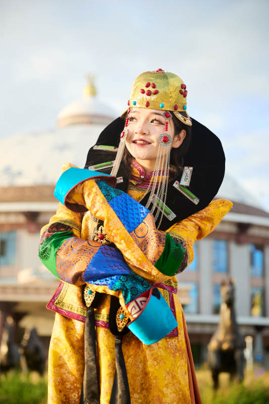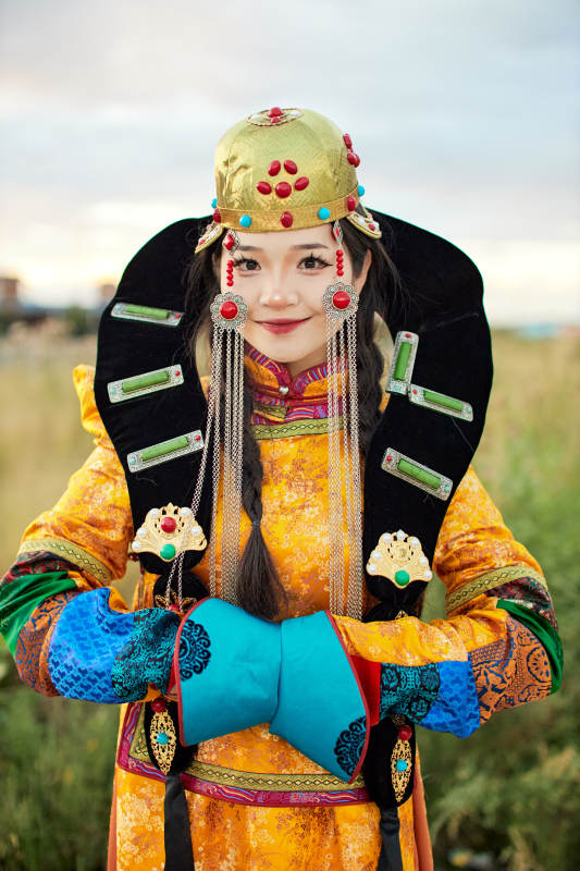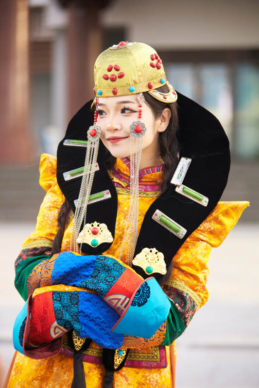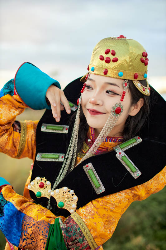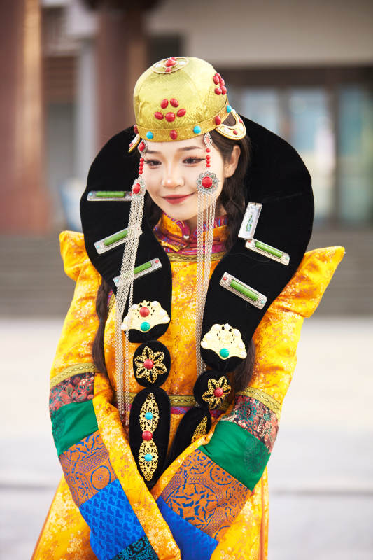 身穿蒙古族喀爾喀部落傳統(tǒng)服飾的蒙族姑娘