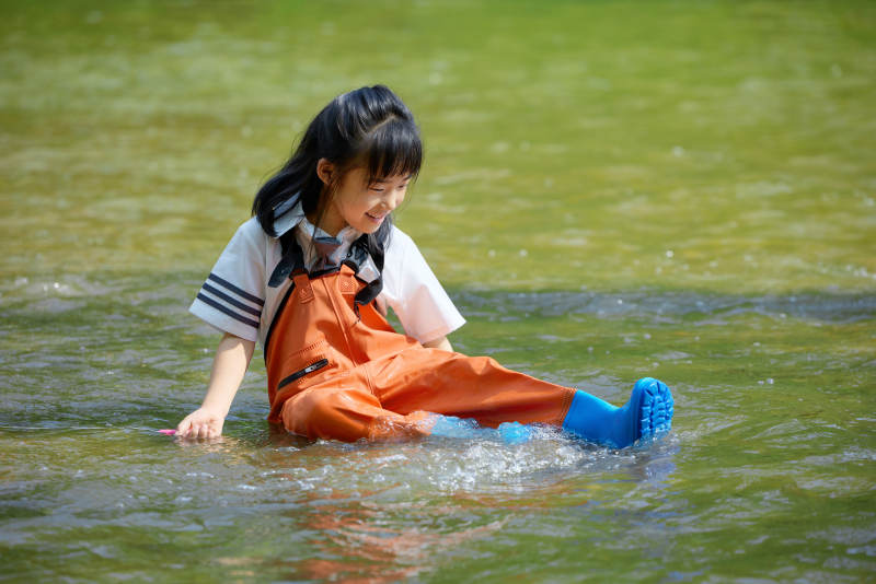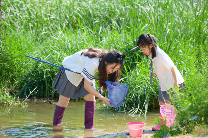 夏天在戶外溪流捕捉魚蝦的母女親子