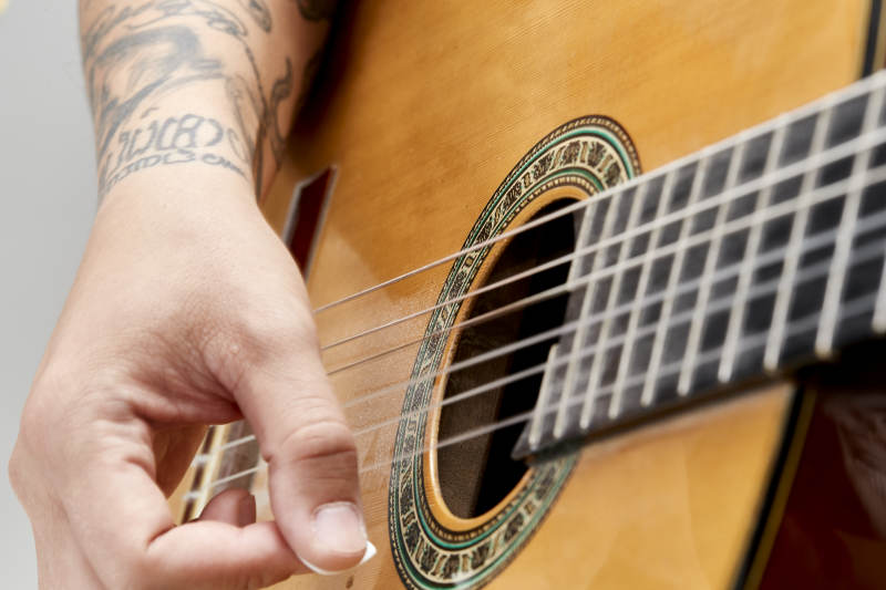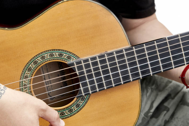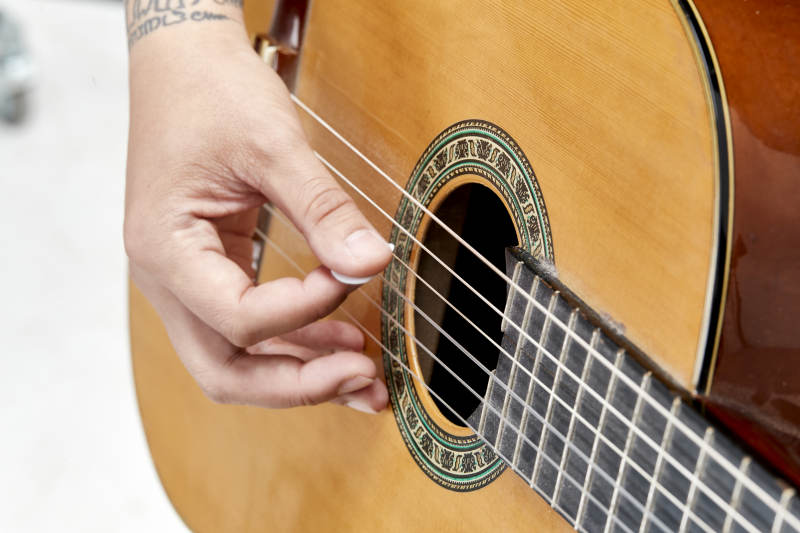 示范演奏古典吉他的亞洲男性樂手人像局部特寫