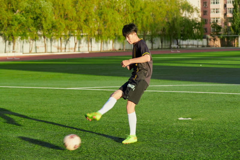 戶外足球場上踢足球的運(yùn)動員