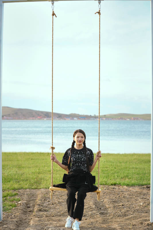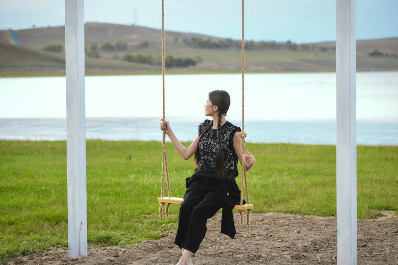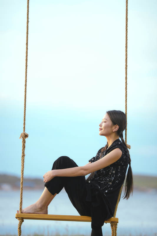 草原湖畔夕陽下蕩秋千的亞洲少女